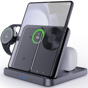 Three-in-one wireless charger folding portable desktop stand for Samsung ZFold6 watch headphones.